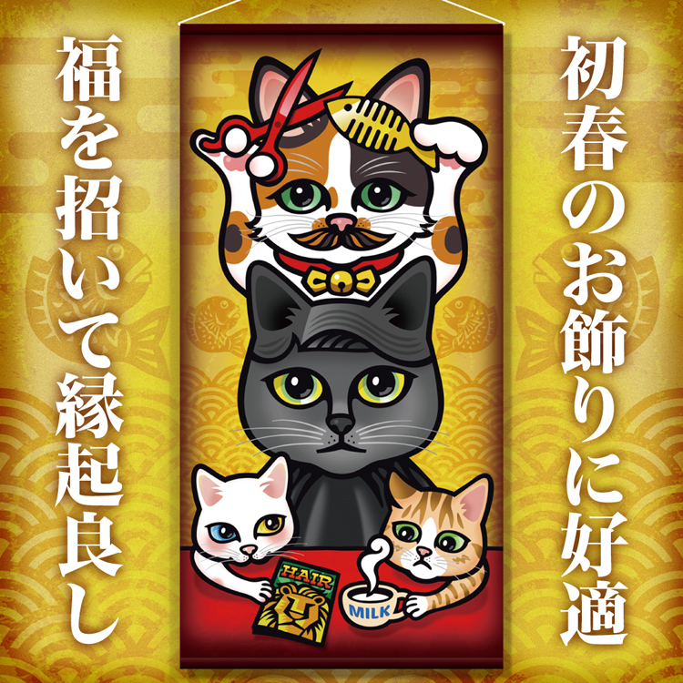 千客万来商売繁盛。三毛猫マスター、イケメン黒猫、チビネコたちの開運タペストリーです。